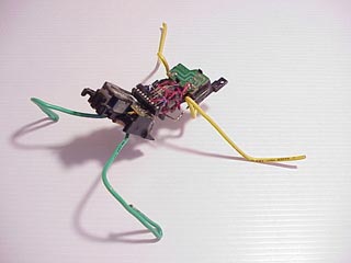 Created by: Ian Bernstein Using two Macintosh floppy drive motors, Ian created Mantis 1.1. It has the ability to reverse if it hits an object through the use of a tactile sensor. This walker also climbs really well of even inch high obstacles. |